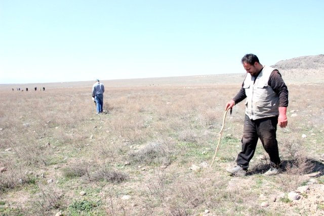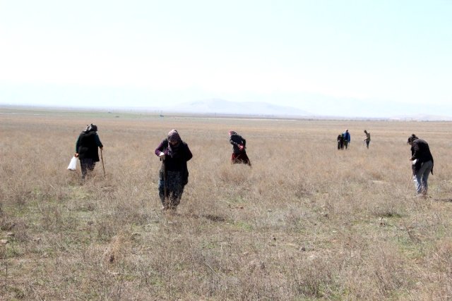 Karaman'da sezonunun başlaması nedeniyle genç yaşlı demeden herkes arazilere akın ederek bastonla dolaman mantarı arıyor.