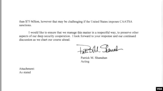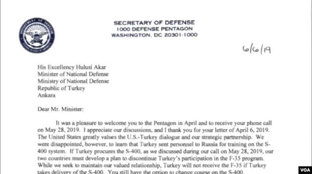 Milli Savunma Bakanı Hulusi Akar Shanahan'ın imzasını taşıyan mektup VOA'da yayınlandı. Mektup ve mektuba iliştirilen belgede Türkiye'nin Rusya'dan S-400 savunma sistemi almaktan vazgeçmemesi halinde Türkiye'nin F-35 programından çıkarılmasına yönelik başka hangi adımların atılacağına yer verildi.