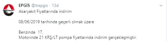 Twitter üzerinden açıklama yapan EPGİS, benzin ve motorine indirim geldiğini açıkladı. Epgis, açıklamasında "08/06/2019 tarihinde geçerli olmak üzere benzinde17, motorinde 21 KRŞ/LT pompa fiyatlarında indirim gerçekleşmiştir." ifadelerini kullandı.