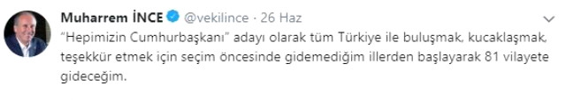 Muharrem İnce, 26 Haziran günü Twitter üzerinden yaptığı açıklamada "Hepimizin Cumhurbaşkanı" adayı olarak tüm Türkiye ile buluşmak, kucaklaşmak, teşekkür etmek için seçim öncesinde gidemediğim illerden başlayarak 81 vilayete gideceğim.'' diyerek kurultay sinyali vermişti.