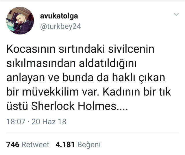 Erzincan'da yaşayan 2 yıllık evli bir kadın aldatıldığını kocasının sırtındaki sivilcelerin sıkılmasından anladı. Genç kadının avukatı, "Kocasının sırtındaki sivilcenin sıkılmasından aldatıldığını anlayan ve bunda da haklı çıkan bir müvekkilim var" şeklinde bir tweet attı. Tweet kısa sürede büyük ilgi gördü ve birçok sosyal medya hesabından paylaşıldı.