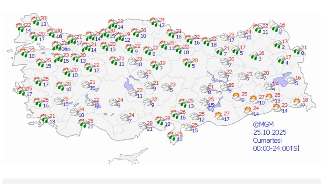 23 Ekim 2025 Perşembe günü; Kıyı Ege'de halen devam eden sağanak ve gök gürültülü sağanak yağışların, gece saatlerine kadar Manisa ve Aydın'ın batı ilçelerinde yerel kuvvetli olması bekleniyor.