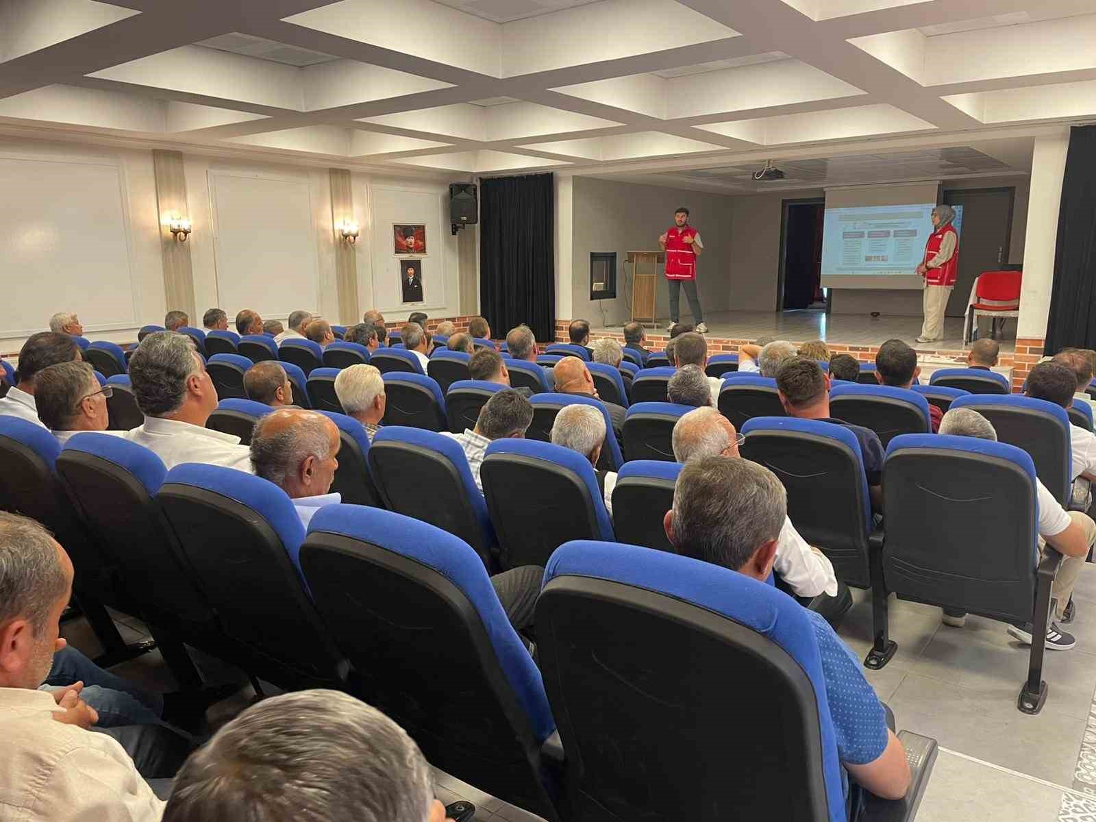 75’nci yıl Cumhuriyet Ortaokulu konferans salonunda, gerçekleştirilen eğitimde semineri, Türk Kızılayı Acil Sağlık Yardımları Müdürü ve Eğitmen Elif Taşkın Aytekin, uzman personeller Göktan Çetin, Derya Derin ve Seher Altuğ tarafından, acil durumlara anında müdahalenin önemi, muhtarlara düşen görevleri ve ilk yardım gibi konularda bilgiler verildi.
