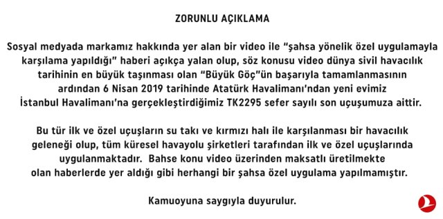 "Sosyal medyada markamız hakkında yer alan bir video ile 'şahsa yönelik özel uygulamayla karşılama yapıldığı' haberi açıkça yalan olup, söz konusu video dünya sivil havacılık tarihinin en büyük taşınması olan "Büyük Göçün başarıyla tamamlanmasının ardından 6 Nisan 2019 tarihinde Atatürk Havalimanı'ndan yeni evimiz İstanbul Havalimanı'na gerçekleştirdiğimiz TK2295 sefer sayılı son uçuşumuza aittir.