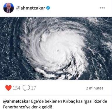 İkinci paylaşımında ise, "Ege'de beklenen Kırbaç kasırgası Rize'de Fenerbahçe'ye denk geldi." yorumunu yaptı ve fotoğraf paylaştı.