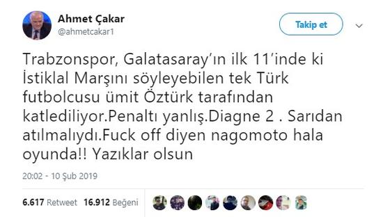 Eski hakem Ahmet Çakar, Yuto Nagatomo'nun atılması gerektiğini iddia ederek "F.ck off diyen Nagatomo hala oyunda! Yazıklar olsun" paylaşımı yaptı.