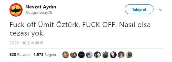 Bu arada Trabzonspor'un eski yöneticilerinden Nevzat Aydın da Yuto Nagatomo'nun 'F.ck off' dediğini iddia ederken, hakem Ümti Öztürk aynı şekilde hitap etti. Trabzonsporlular bu paylaşıma destek verdi.