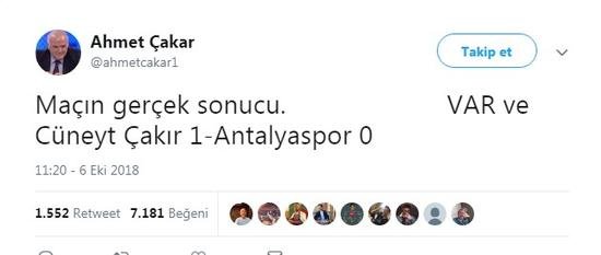 Maçtan sonra karşılaşmanın hakemi Cüneyt Çakır ve VAR hakkında paylaşım yapan Ahmet Çakar, "Maçın gerçek sonucu. VAR ve Cüneyt Çakır 1-Antalyaspor 0" ifaderini kullandı.