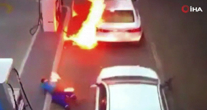 Yakıt pompasının araçtan çıkması ile yere dökülen yakıtın, bir anda alev alması ile istasyon görevlisi alevlerin arasında kalmaktan son anda kurtuldu. Olayda hafif şekilde yaralanan görevlinin, bacağının ve kolunun alev aldığı görüldü.