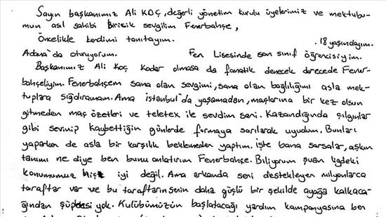 Lise öğrencisi, yazdığı mektupta Ali Koç'a olan sevgisine vurgu yaparak, liseler arası masa tenisi turnuvasında birinci olduğunu ve buradan kazandığı parayı da "Fener ol" kampanyasına göndermek istediğini iletti.