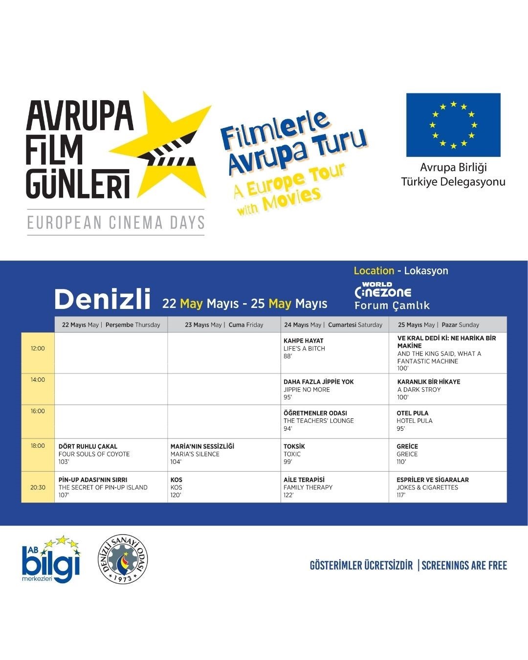Avrupa Birliği (AB) Türkiye Delegasyonu ve Denizli Sanayi Odası iş birliğiyle düzenlenen ‘Avrupa Film Günleri’ Denizli’de başlıyor. 22-25 Mayıs tarihlerinde arasında 4 gün boyunca ücretsiz film gösterimlerinin yapılacağı bu etkinlikte, Avrupa’nın seçkin filmleri sinemaseverler ile buluşacak.