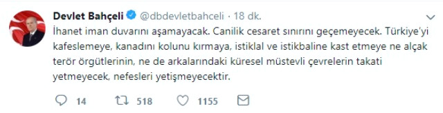 İhanet iman duvarını aşamayacak. Canilik cesaret sınırını geçemeyecek. Türkiye'yi kafeslemeye, kanadını kolunu kırmaya, istiklal ve istikbaline kast etmeye ne alçak terör örgütlerinin, ne de arkalarındaki küresel müstevli çevrelerin takati yetmeyecek, nefesleri yetişmeyecektir.
