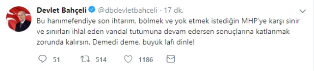 Bu hanımefendiye son ihtarım, bölmek ve yok etmek istediğin MHP'ye karşı sinir ve sınırları ihlal eden vandal tutumuna devam edersen sonuçlarına katlanmak zorunda kalırsın. Demedi deme, büyük lafı dinle!