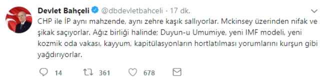 CHP ile İP aynı mahzende, aynı zehre kaşık sallıyorlar. Mckinsey üzerinden nifak ve şikak saçıyorlar. Ağız birliği halinde; Duyun-u Umumiye, yeni IMF modeli, yeni kozmik oda vakası, kayyum, kapitülasyonların hortlatılması yorumlarını kurşun gibi yağdırıyorlar.