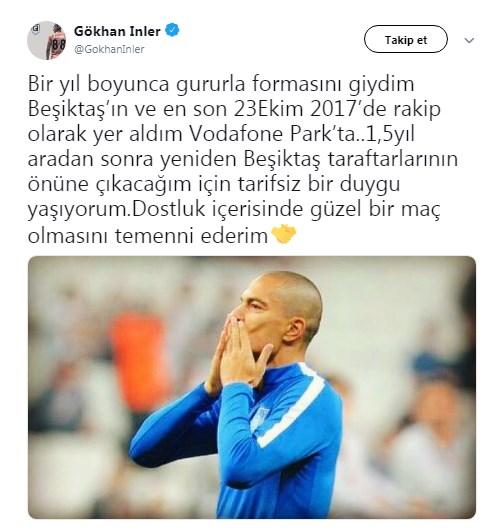 Gökhan İnler paylaşımında, "Bir yıl boyunca gururla formasını giydim Beşiktaş'ın ve en son 23 Ekim 2017'de rakip olarak yer aldım Vodafone Park'ta. 1,5 yıl aradan sonra yeniden Beşiktaş taraftarlarının önüne çıkacağım için tarifsiz bir duygu yaşıyorum. Dostluk içerisinde güzel bir maç olmasını temenni ederim." ifadeleri yer aldı.