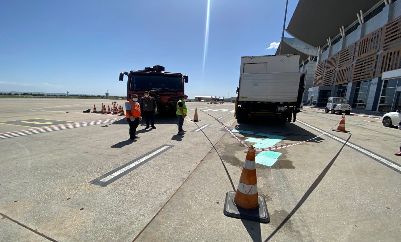 Eğitim senaryosu kapsamında, bir yolcu uçağına hizmet veren yer hizmet kuruluşuna ait ambulift aracı (engelli ve yaşlı yolcuların uçağa iniş-binişini kolaylaştıran asansörlü araç), apron sahasında hareket halindeyken yakıt sızıntısı simüle edildi. Eğitime katılan havalimanı personeli, senaryo gereği, durumu hızla ilgili birimlere bildirerek 2 dakika içinde tahliye işlemini tamamladı. Havalimanı çevre sorumlusu ve ilgili birimlerin personeli dökülen kimyasalın muhtemel etkilerini değerlendirerek güvenli müdahale prosedürlerini uyguladı. Kimyasal emici malzemelerle sızıntı kontrol altına alındı ve tehlikeli atıklar uygun şekilde bertaraf edildi.