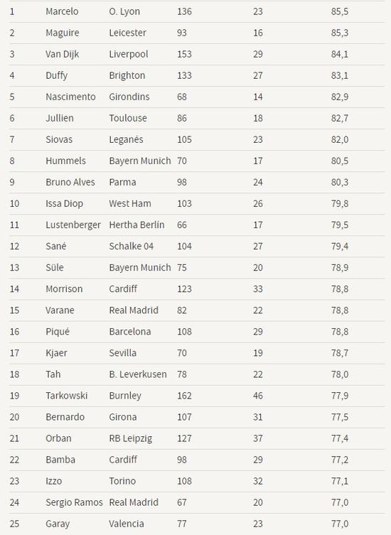 Fenerbahçe'nin eski stoperlerinden Bruno Alves, Parma'daki performansı ile 9. sıraya [%80,3], Simon Kjaer ise Sevilla'da 17. basamağa [%78,7] yerleşti.