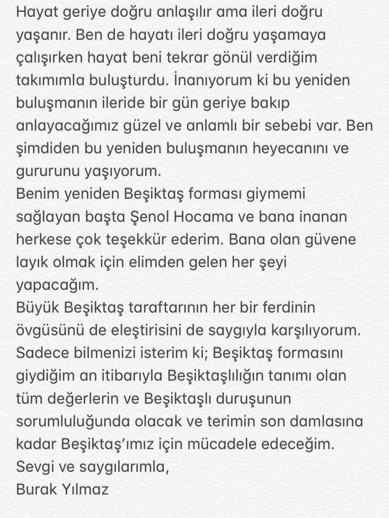 Beşiktaş'ın Trabzonspor'dan kadrosuna kattığı Burak Yılmaz, sosyal medya hesabından bir açıklamada bulundu. Beşiktaş taraftarına da bir mesaj gönderen Burak Yılmaz, siyah-beyazlı takımın teknik direktörü Şenol Güneş'e de teşekkür etti.