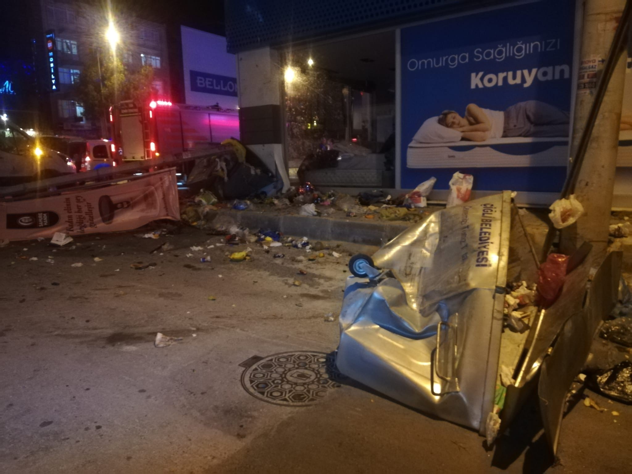 Çöp konteynerleri ile aydınlatma direğine çarpan otomobil takla attı...O anlar kamerada