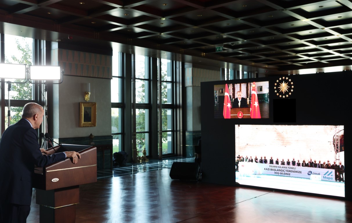 Cumhurbaşkanı Recep Tayyip Erdoğan, canlı bağlantıyla katıldığı Türkiye’nin sulama amaçlı en büyük tüneli olan Silvan Tüneli’nde kazı başlangıç töreninde konuştu. Erdoğan, "Rahmetli Özal, devrinin çok ötesinde politikalarla Türkiye’ye yeni bir ufuk çizmekle kalmamış, milli iradenin yılmaz bir savunucusu olmuştur. Ülkemizin dışa açılma sürecinde ekonomiden hak ve özgürlüklere birçok alanda attığı vizyoner adımlarla Türkiye’nin bugünlere gelmesinde önemli pay sahibi bir siyasetçi olarak ismini milletimizin kalbine yazdırmıştır. Kendisini bir kez daha minnetle, özlemle anıyor, ülkemize, milletimize ve demokrasimize yaptığı hizmetler için Mevla ondan razı olsun diyorum" dedi. Son derece önemli ve tarihi nitelikte bir projenin ilk adımının atıldığını belirten Cumhurbaşkanı Erdoğan, "Biliyorsunuz su hayatın, üretimin, medeniyetin, enerjinin membaıdır. Su yoksa bereket yoktur, yeşil yoktur, hayat yoktur. Daha önce petrol ve karbon yakıtlar için edilen kavgaların önümüzdeki dönemde su alanında yapılacağı görülüyor. Çünkü su bu yüzyılın en stratejik ve en değerli kaynağıdır. Ancak son yüzyılda iklim değişikliği, kuraklık, artan nüfus ve kentleşmeyle birlikte su kaynakları üzerindeki baskılar da girerek artıyor. Dikkat ederseniz kuraklıklara, sellere, orman yangınlarına artık daha sık şahit olmaya başladık. İşte son olarak geçen hafta ülkemizde birçok ilimizi olumsuz etkileyen bir zirai don hadisesi yaşadık. Bilim insanları bizi gelecekte çok daha zor günlerin beklediğini söylüyor" ifadelerini kullandı.