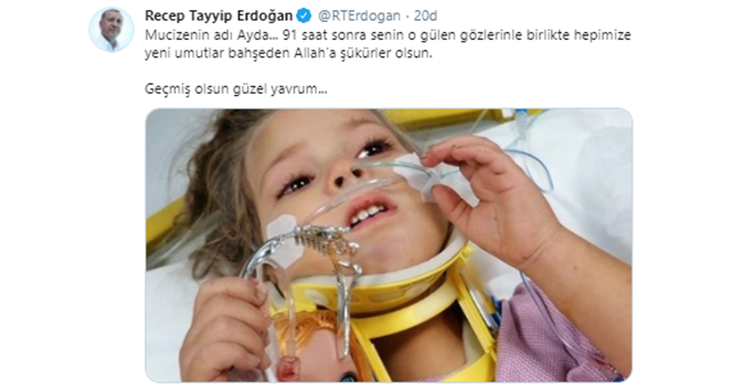 Cumhurbaşkanı Erdoğan, "91 saat sonra senin o gülen gözlerinle birlikte hepimize yeni umutlar bahşeden Allah'a şükürler olsun. Geçmiş olsun güzel yavrum." notuyla Ayda'nın fotoğrafını sosyal medya hesabından paylaştı.