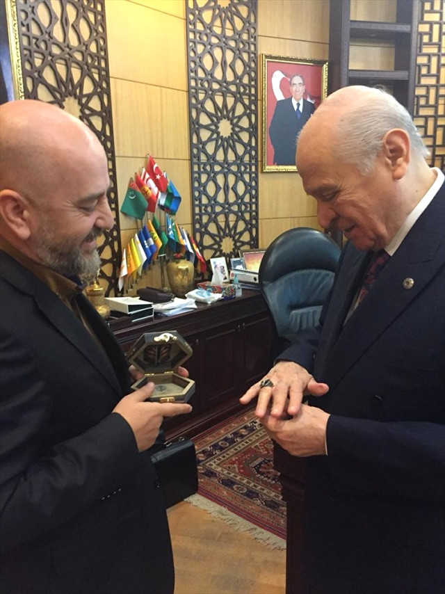 MHP Genel Başkanı Devlet Bahçeli'ye, tutkunu olduğu klasik otomobilinin figürünü taşıyan bir yüzük hediye edildi. Takı tasarımcısı Servet Küçükdemirel, Bahçeli için üzerinde zaman zaman kullandığı 1982 model Chrysler marka otomobilin figürü ile ülkücülüğün ilkesi 9 ışığı simgeleyen 9 yıldız bulunan bir yüzük tasarladı. Özel tasarım yüzüğe MHP liderinin isim ve soy isminin baş harfleri "D" ve "B" de işlendi.