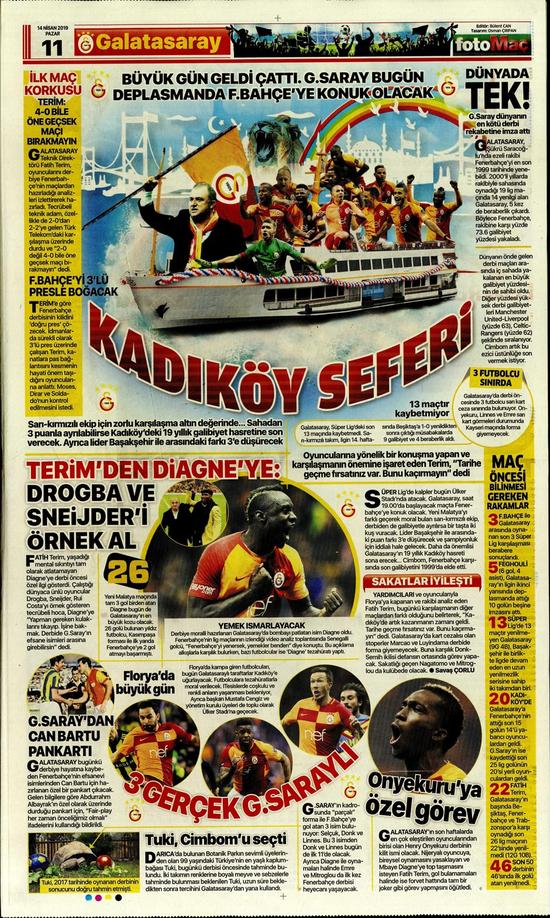 Yardımcıları ve oyuncularıyla Florya'ya kapanan ve rakibi analiz eden Fatih Terim, bugünkü karşılaşmanın diğer maçlardan farklı olduğunu belirterek, "Kadıköy'de artık kazanmanın zamanı geldi. Tarihe geçme fırsatınız var. Bunu kaçırmayın" dedi. Galatasaray'da kart cezalısı olan stoperler Marcao ve Luyindama derbide forma giyemeyecek. Buna karşılık Donk-Semih ikilisi defansın ortasında görev yapacak. Sakatlığı geçen Nagatomo ve Mitroglou da kulübede olacak.