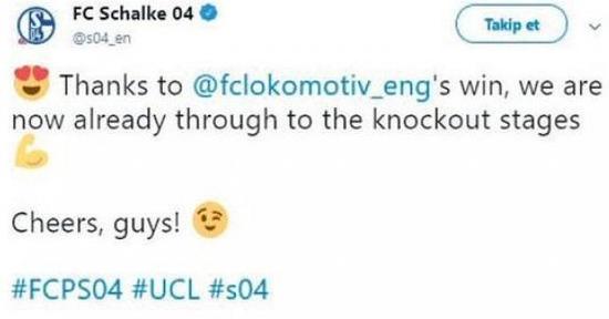 Fatih Terim, Lokomotiv Moskova ile Schalke 04 arasındaki karşılıklı tweetler ile ilgili soruya, "Şampiyonlar Ligi gibi çok yüksek bir kalibrede oynanan bir oyun içinde bunları espri olarak kabul ediyorum. Schalke'nin sevincinden dolayı böyle bir tweet attığını, Lokomotiv'in de çok güzel bir espri yaptığını düşünüyorum. Gönül isterdi ki biz bir tweet atalım, 'Haydi Lokomotiv' diye. Yenseydik Moskova'da, 8-7 gelirdik buraya. O yüzden 'Haydi Galatasaray' demeye devam ediyoruz." cevabını verdi.