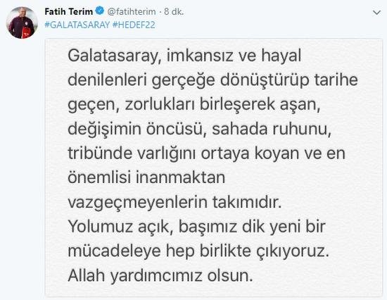 Sosyal medya hesabı üzerinden yaptığı paylaşımda 'Hedef 22' vurgusu yapan deneyimli teknik adam, "Galatasaray, imkansız ve hayal denilenleri gerçeğe dönüştürüp tarihe geçen, zorlukları birleşerek aşan, değişimin öncüsü, sahada ruhunu, tribünde varlığını ortaya koyan ve en önemlisi inanmaktan vazgeçmeyenlerin takımıdır. Yolumuz açık, başımız dik, yeni bir mücadeleye hep birlikte çıkıyoruz. Allah yardımcımız olsun" ifadelerine yer verdi.