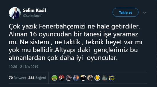 Fenerbahçe'de, Aziz Yıldırım döneminde yöneticilik yapmış olan Selim Kosif, Aytemiz Alanyaspor - Fenerbahçe maçı esnasında bir tweet attı.