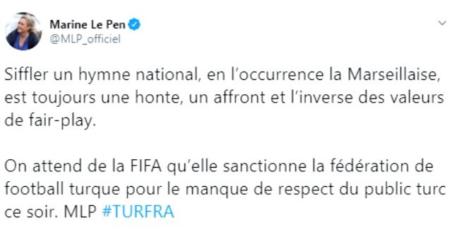 Fransa'nın aşırı sağcı Ulusal Cephe Partisi Genel Başkanı Marine Le Pen de Fransız Milli Marşı'nın Türk seyirciler tarafından ıslıklanmasına tepki gösterdi.