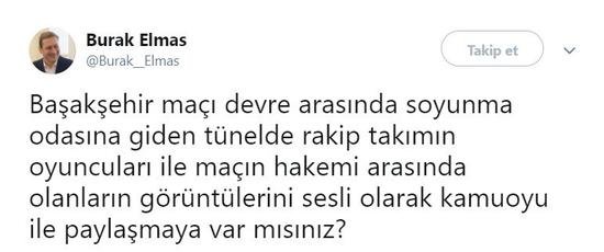 Burak Elmas, ''Başakşehir maçı devre arasında soyunma odasına giden tünelde rakip takımın oyuncuları ile maçın hakemi arasında olanların görüntülerini sesli olarak kamuoyu ile paylaşmaya var mısınız?'' paylaşımında bulundu.