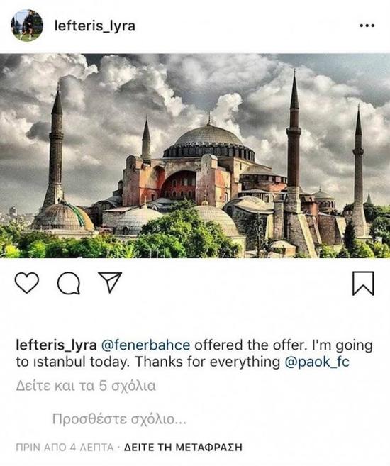 Genç futbolcu, Instagram hesabından Ayasofya'nın fotoğrafını paylaşırken ''Fenerbahçe'den teklif aldım. İstanbul'a gidiyorum. Teşekkürler PAOK'' sözlerini kullandı.
