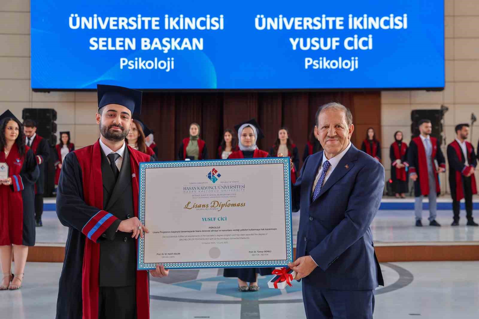 Konuşmaların ardından Hasan Kalyoncu Üniversitesi’nin 2024 - 2025 öğretim yılını dereceyle tamamlayan üniversite birincisi, ikincisi ve üçüncüsüne başarı belgeleri ve ödülleri Cumhurbaşkanı Yardımcısı Cevdet Yılmaz ve Gaziantep Eğitim ve Hizmet Vakfı Başkanı Cemal Kalyoncu tarafından takdim edildi.