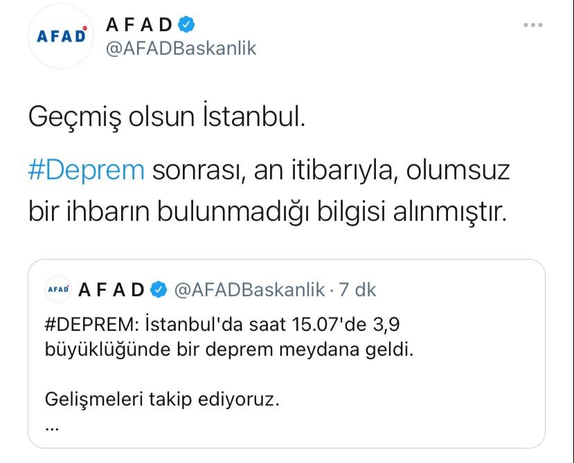 Açıklamada, "Geçmiş olsun İstanbul. Deprem sonrası, an itibarıyla, olumsuz bir ihbarın bulunmadığı bilgisi alınmıştır" denildi.