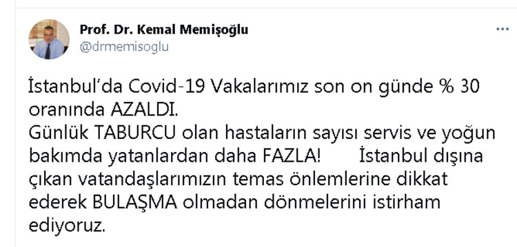 İstanbul İl Sağlık Müdürü Prof. Dr. Kemal Memişoğlu, sosyal medya hesabı üzerinden yaptığı açıklamada, “İstanbul’da Covid-19 vakalarımız son on günde yüzde 30 oranında azaldı. İstanbul dışına çıkan vatandaşlarımızın temas önlemlerine dikkat ederek bulaşma olmadan dönmelerini istirham ediyoruz” dedi.