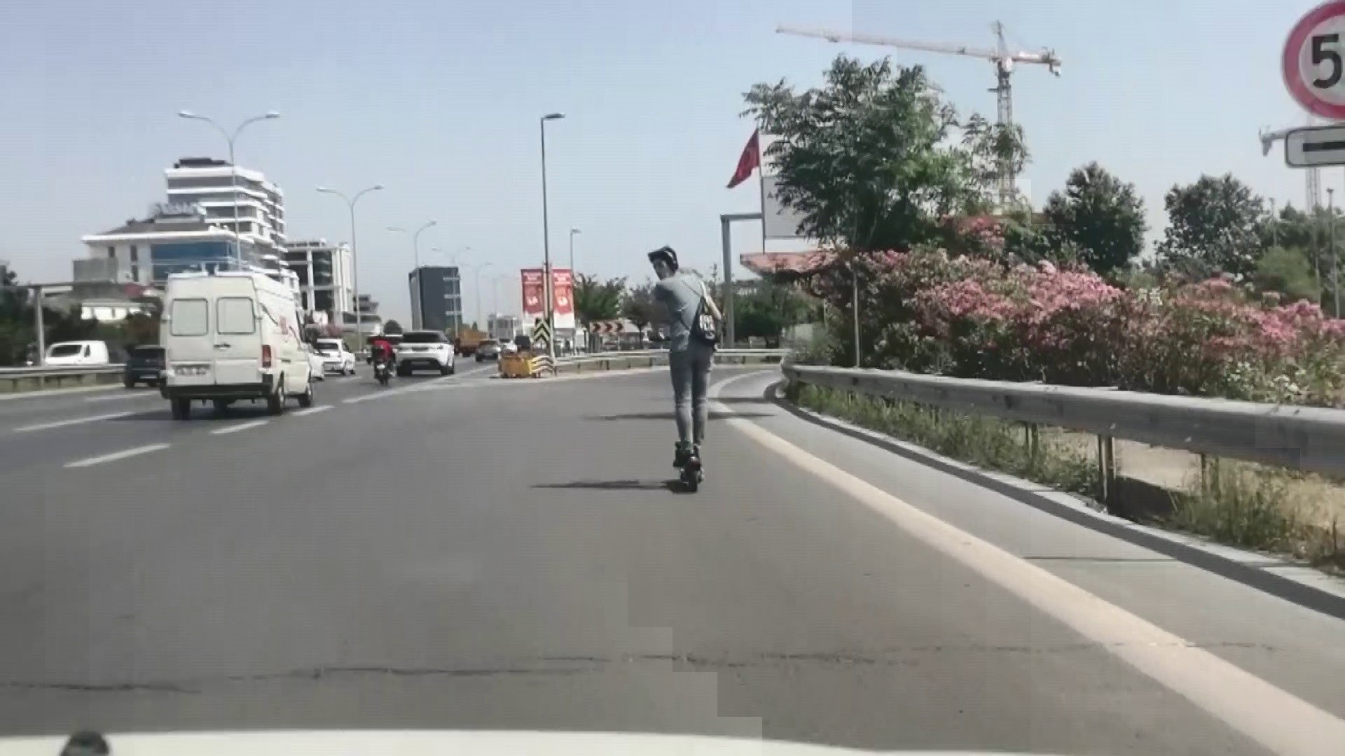 E-5 karayolu Kartal mevkiinde yoğun araç trafiğine rağmen “martı” isimli elektrikli scooter ile yolculuk yapan genç adeta canını tehlikeye attı. Seyir halinde olan otomobillere aldırmadan karayolunda scooter ile yolculuk eden genç, hem trafikteki diğer sürücüleri hem de kendi canını tehlikeye attı. Araçların süratli olduğu yolda elektrikli scooter ile tehlikeli yolculuk eden genç, yürekleri ağza getirdi. Genç, daha sonra yol kenarına gelerek scooterını bağladı.