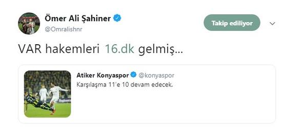 Konyaspor'un yıldızı Ömer Ali Şahiner de, "VAR hakemleri 16. dk gelmiş..." yazarak hakem kararını protesto etti.