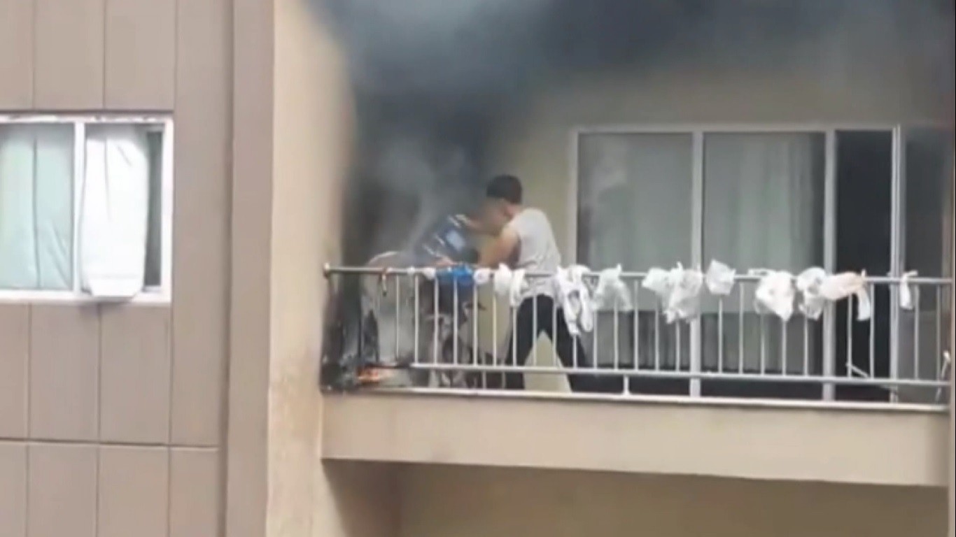 Koku ve dumanların açık balkon kapısından içeri geldiğini fark eden ev sahibi balkona çıktığında poşetlerin ve orada bulunan diğer eşyaların alev aldığını gördü. İçeriden bir damacana suyla balkona geri gelen ev sahibi yangını kısa süre söndürmeyi başardı. Karşı binada bulunan başka komşusu o anları cep telefonu ile anbean kaydetti.