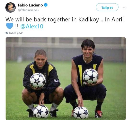 Tweette, efsane futbolcu Alex de Souza ile birlikte olduğu bir fotoğrafı paylaşan Luciano, "Nisan ayında Alex ile birlikte tekrar Kadıköy'de olacağız" ifadelerini kullandı.