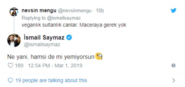 Gazeteci İsmail Saymaz ile Nevşin Mengü, sosyal medya hesaplarından hamsi üzerine polemiğe girdi. "NE YANİ HAMSİDE Mİ YEMİYORSUN?" Nevşin Mengü, İsmail Saymaz'ın Karatay diyetiyle ilgili yazdıklarına sosyal medya hesabında yanıt vererek "Veganlık sultanlık canlar.
