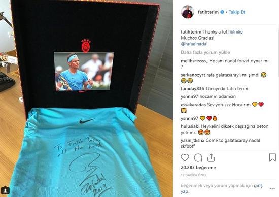 Galatasaray Teknik Direktörü Fatih Terim, Rafael Nadal'dan kendisine gönderilen hediyeyi sosyal medya hesabından paylaşarak, İspanyol rakete teşekkür etti.