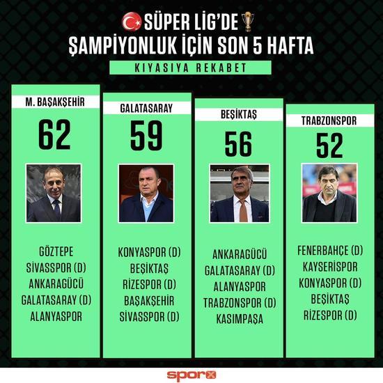 Fatih Terim, ligde kalan maçlar tablosunu işaret edip, futbolcularıyla şampiyonluk konuşması yaptı. Başakşehir'in, Rizespor'a takılması, Galatasaray'ın da Kayserispor'u yenmesiyle puan farkının 3'e inmesi Aslan'da 22. şampiyonluğa olan inancı zirveye çıkardı. Yarıştaki rakibiyle sondan bir önceki hafta Türk Telekom Stadı'nda oynayacağı için ipleri eline geçirme şansı doğan sarı kırmızılı takımda Fatih Terim, takımına yeni hedefi aktardı.