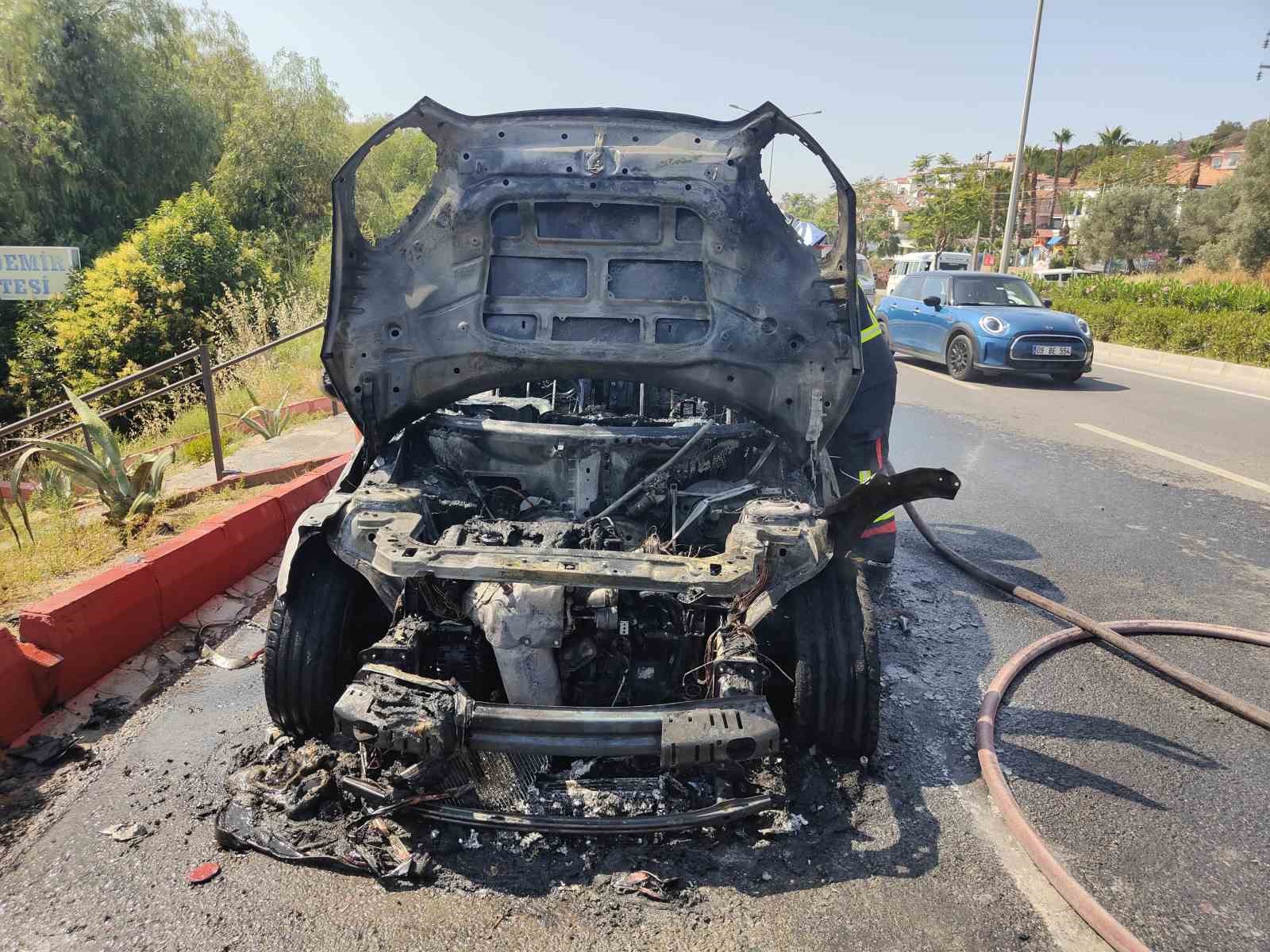 Aydın’ın Kuşadası ilçesinde seyir halindeyken çıkan yangında alev topuna dönen araçtan geriye iskeleti kaldı.