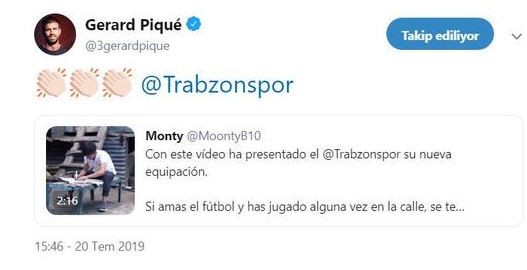 Trabzonspor Kulübü, resmi twitter hesabından teşekkür ettiği Pique'ye, “Sana ve değerli ailene gri formadan göndereceğiz. Bordo-Mavi Trabzonspor'dan, Bordo-Mavi Barcelona'ya sevgilerle” notuyla forma gönderme sözü verdi.