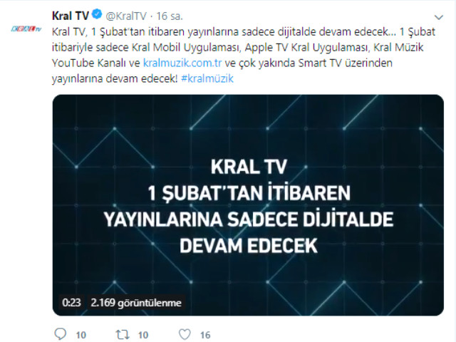 "Kral TV, 1 Şubat'tan itibaren yayınlarına sadece dijitalde devam edecek… 1 Şubat itibariyle sadece Kral Mobil Uygulaması, Apple TV Kral Uygulaması, Kral Müzik YouTube Kanalı, kralmuzik.com.trve çok yakında Smart TV üzerinden yayınlarına devam edecek!"